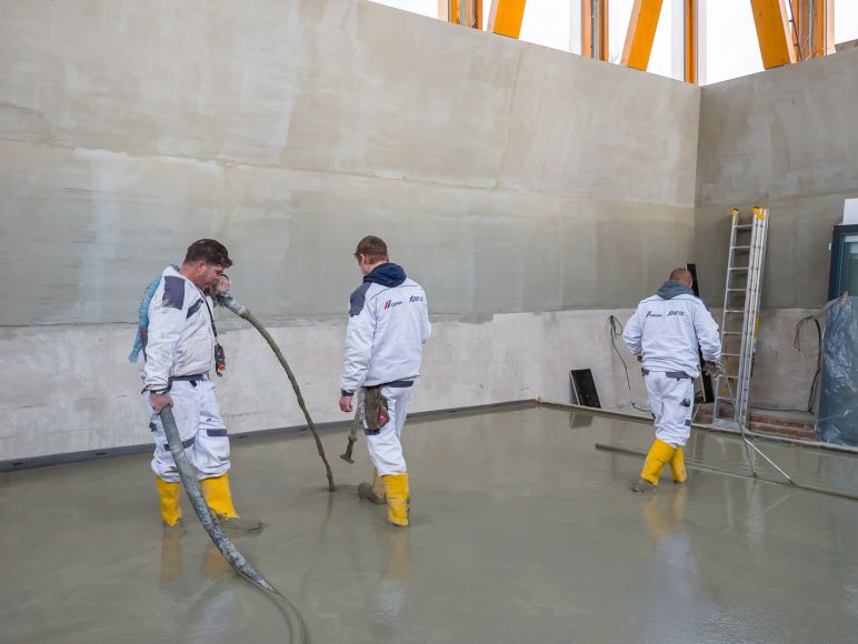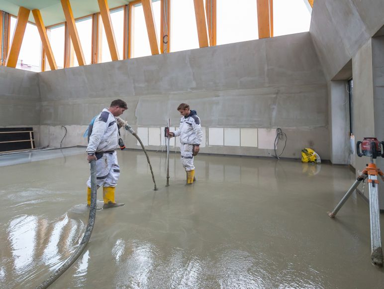 Pokládka cementového litého potěru v modlitebně v Čelákovicích na podlahové topení. Následným vybroušením a vyleštěním potěru vznikne finální nášlapná vrstva podlahy.